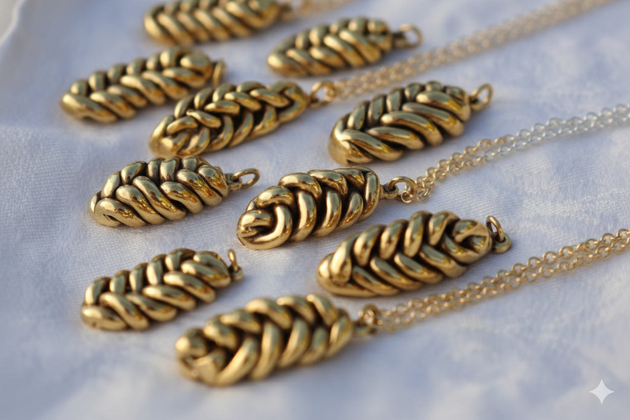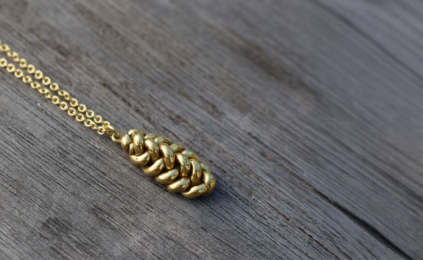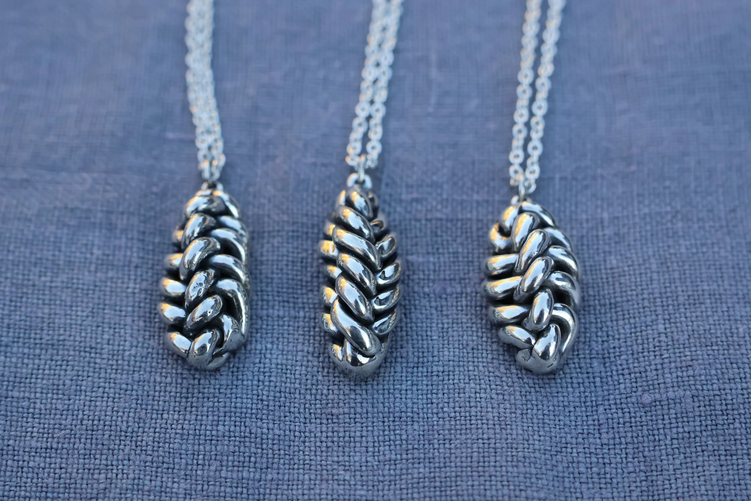 Malkaleh jewelry is designed and crafted by hand in Washington, DC. Each challah pendant is hand-braided, carved, and shaped in wax before being cast in sterling silver. The miniature loaves are then filed, sanded, and polished to bring out their unique, organic forms.